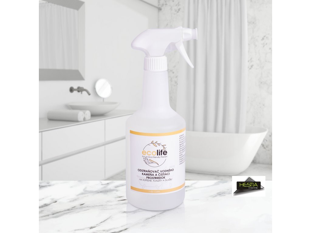 Pýtate sa: “Ako odstrániť vodný kameň?” Samozrejme s EcoLIFE Čistič a odstraňovač vodného kameňa na kúpeľne, toalety a dlažbu – veľmi jednoducho. EcoLIFE rýchlo a účinne odstráni vodný kameň, pričom nepoškodzuje nerezové povrchy. Neobsahuje dusičnany, halogény a fosfáty. Vyrobený z prírodných ingrediencií rastlinného pôvodu, balený v recyklovateľných fľašiach. Neobsahuje látky živočíšneho pôvodu. Počas vývoja nebol testovaný na zvieratách.